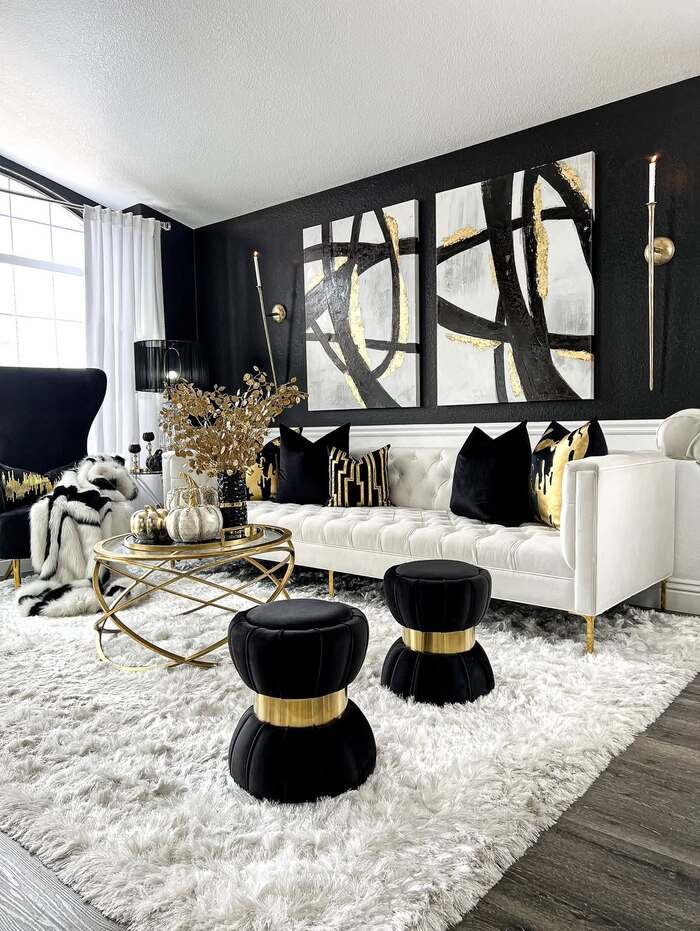 When I saved this one, I whispered wow to my phone like a weirdo. It’s rich, it’s shiny, it’s still tight on palette. The fluffy white rug sets a quiet base, then the abstract triptych punches in crisp black strokes with metallic flashes. This is a great path for black and white living room decor men who want drama with polish. The white tufted sofa reads tailored, not stuffy, and those sculptural stools feel like little tuxedos with gold cummerbunds. I’m not even mad at the pumpkins. They’re graphic and funny.