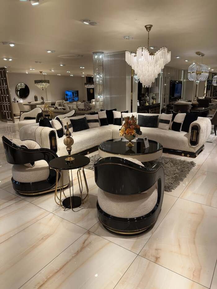 This room convinced me that curves are not soft in a weak way. They’re confident. The chairs, the sectional corners, even the cocktail table all have rounded edges that let the eye glide. Men’s black and white living room decor gets powerful when shapes repeat like this. The cream fabric has a subtle rib that catches light, while the piano black frames add weight. It feels like a lounge where the ice clinks a little louder, you know.
