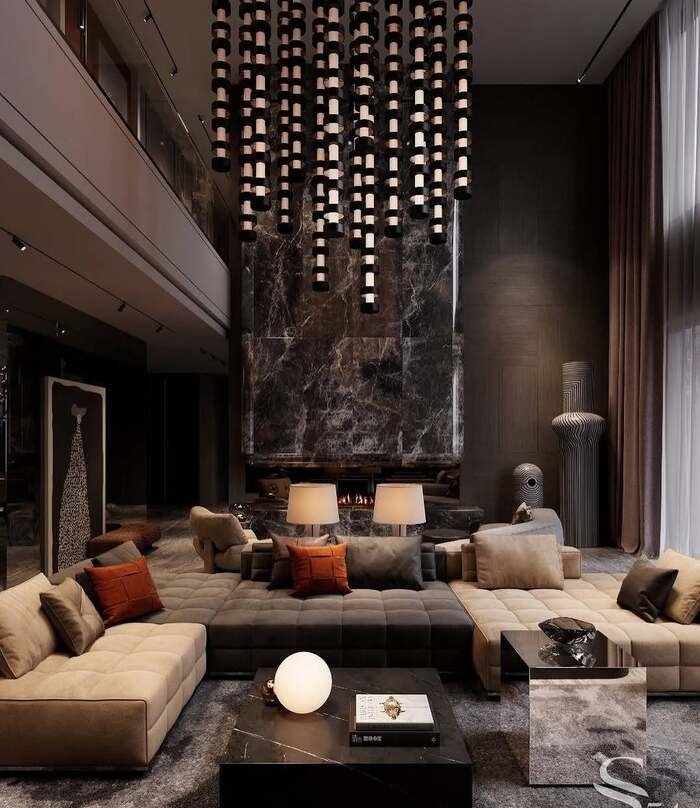 I’m not built for dainty furniture, and this space agrees. The low modular sofa is a grid of soft squares, almost like a giant mattress that remembered to be chic. Behind it, a dark stone fireplace climbs up and makes everything feel grounded. If you are building black and white living room decor men but have a big room that swallows normal furniture, this is your lane. Go lower, go broader, and let scale do the talking.