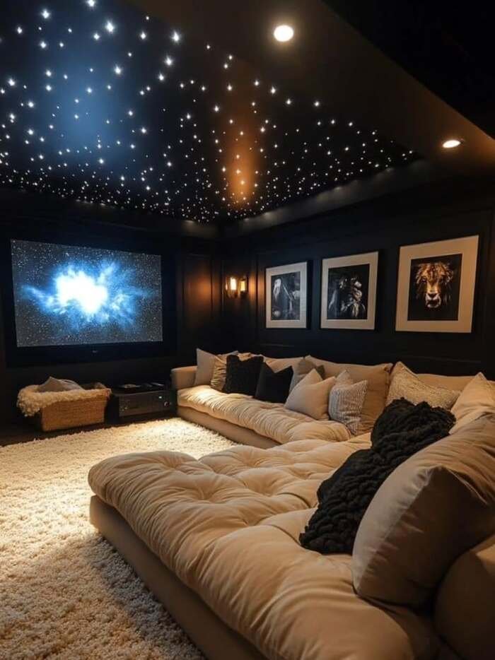 Here’s how I’d execute. Paint walls and trim one satin charcoal. Install inexpensive fiber optic lights or a prebuilt star panel overhead. Keep art monochrome and moody, like black and white portraits in simple frames. Use a pale shag or boucle rug to keep feet cozy and to break up the darkness. Add one slim wall sconce pair near the screen so you have gentle light for snacks. Hide cables in raceways. And, personal tip from my snack spill incident, keep a big tray on the ottoman. Saves the upholstery and your stress.