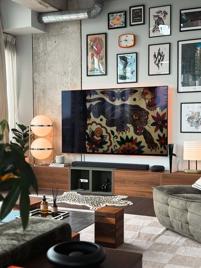 This one gave me city loft vibes without being cold. Exposed concrete, a long wood media cabinet, mixed art frames, and a few quirky lamps. The core still sits in the black and white lane, but small hits of olive and burnt orange make it feel real life. If you want black and white living room decor men that doesn’t feel too strict, try this playful balance. The TV blends into the gallery wall instead of floating lonely.