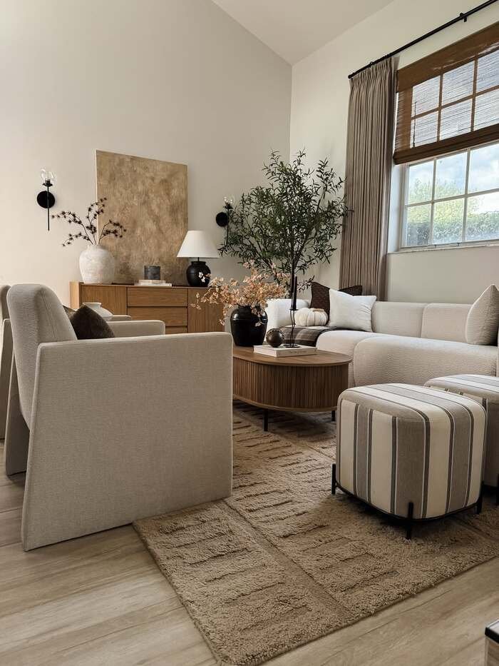 To build it, start with warm beige paint or limewash, then choose furniture in varying textures. Nubby chair, smooth sofa, ribbed wood. Repeat black in three to five tiny hits. A small lamp, a black bowl, and a single framed sketch might be all you need. Bring life with branches instead of flowers. They last longer and feel architectural. If your space has high ceilings, hang drapery a touch higher than the window to stretch the room. It’s calm, it’s friendly, and super easy to maintain.