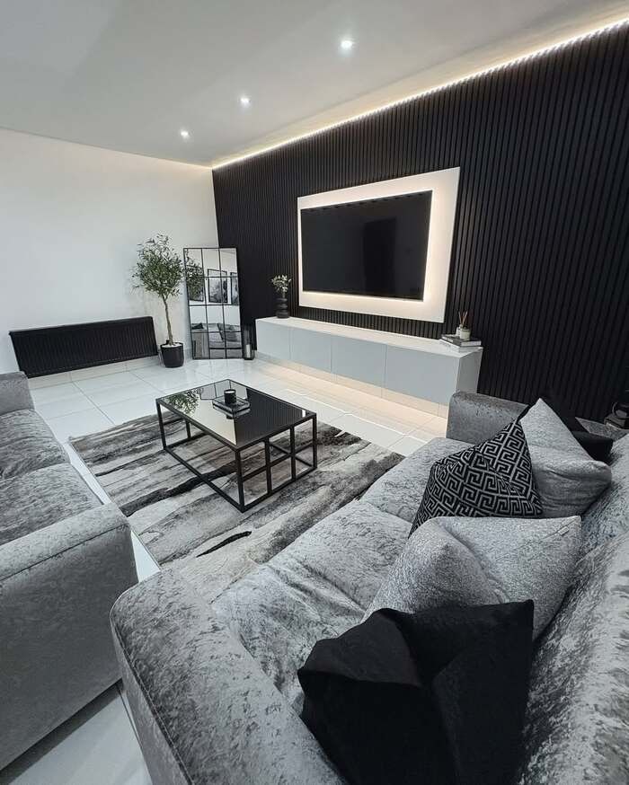 I’m a firm believer that lighting is cheat code, and this room proves it. Vertical black slats hide a wash of LED light around the TV, so the screen feels built in even if the wall is simple drywall. Two deep gray sofas face off with a slim glass coffee table. The whole thing reads crisp, almost like a luxury hotel lounge. For black and white living room decor men who love tech, this is the move.