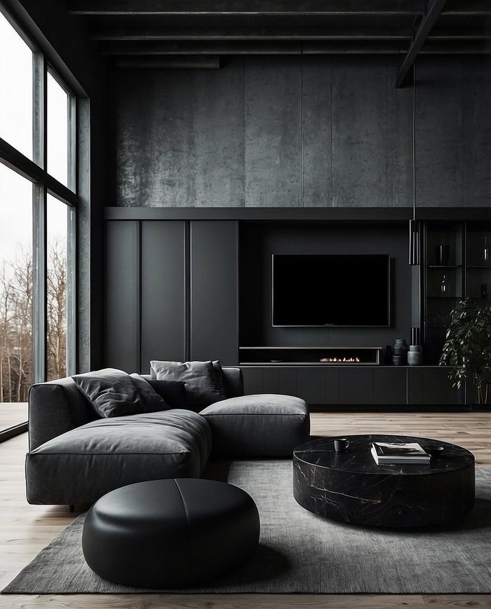 Now the opposite mood. Deep matte walls, low slouchy sofa, round black tables. This is a cocoon, the kind you sink into after loud days. A masculine black and white living room doesn’t require pure white. Off-white throws, pale gray rugs, and soft lighting keep it from becoming a cave. My confession here: I tried a glossy black wall once. Disaster. Fingerprints for days. Matte finishes forgive real life and look more architectural.
