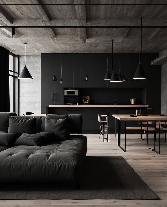To copy it, pick one black finish and stick to it. Don’t mix five different blacks. If the cabinets are satin, repeat satin on the pendants and media console. Add warmth with light oak stools and a matching dining table. The contrast reads masculine but friendly. Keep appliances tucked or panel-ready if possible. On the sofa, go for deep gray with oversized cushions. A monochrome living room for men looks best when comfort wins. So keep a stack of throws at the ready and call it a night.