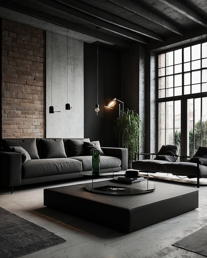 I’m a sucker for that old-factory energy. Black frames on big windows, mixed concrete and brick, and furniture that sits low. Here’s where men’s black and white living room decor meets texture city. The palette stays limited, the materials do the storytelling. One trick I learned stalking IG captions: choose one rough surface and one refined surface right next to it. Rough brick behind a sleek black floor lamp. Concrete floor under a soft wool rug. The contrast feels intentional.