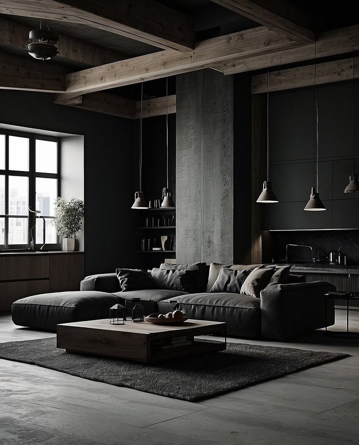 Sometimes the best tweak is adding wood. This idea uses big wood beams and a chunky coffee table to warm up a charcoal room. The lesson for black and white living room decor men is balance. Black can read serious, wood softens it. My small confession: I used to match all woods perfectly. It looked fake. Now I let a couple tones mix. Walnut next to oak is fine if the undertones don’t fight.