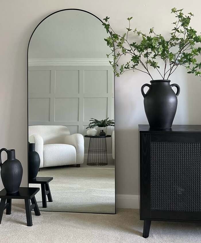 This idea is a cheat code for small spaces. An oversized black-framed arch mirror leans against the wall and doubles the room. On the side, a black cabinet and sculptural pottery become a calm vignette. Here’s a real life tip from me fumbling in a store aisle. Tape out the mirror size on your wall before buying. These mirrors look best when they’re massive, almost door-tall. Men’s black and white living room decor rewards bravery.