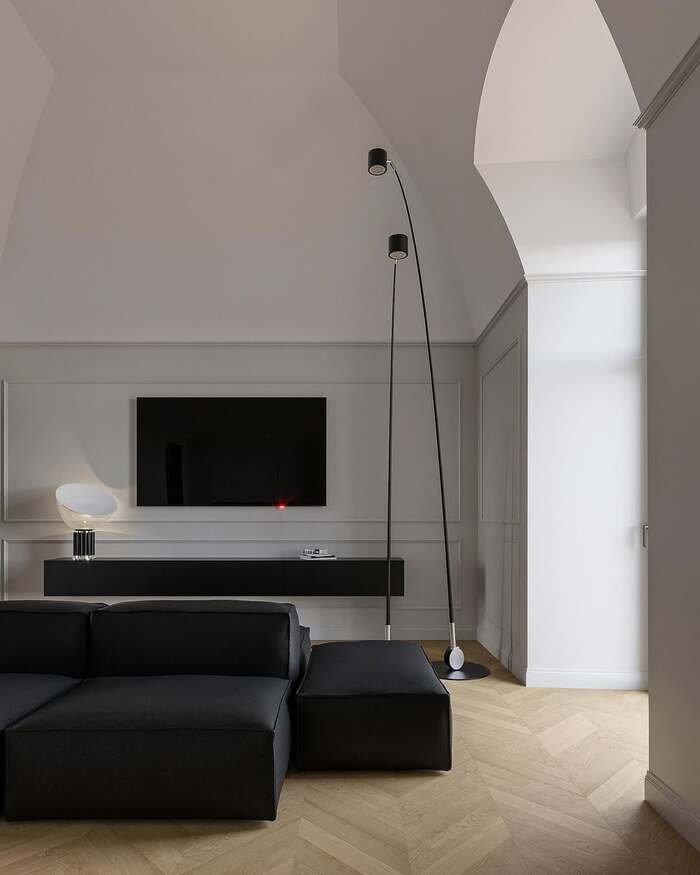 TV walls are tricky. This one uses a low floating black shelf and a spare, quirky floor lamp with two tiny heads. The negative space is the feature. I used to pack my TV wall with media towers and it looked like a store display. The minimalist route feels calmer, and honestly cleaning is faster. That counts. For black and white living room decor men, simple lines read stronger than bulky storage that gathers dust.