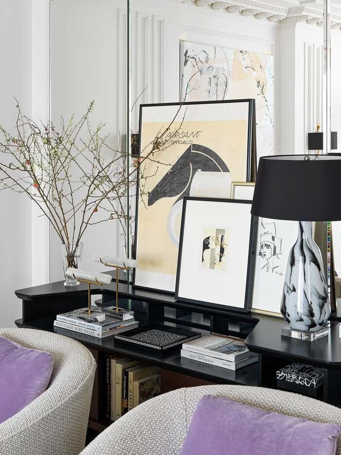 Here’s the artsy moment. A black console stacked with frames, books, and a glass lamp in marbled black and white. It proves a masculine black and white living room can be creative without color explosions. The trick is stacking frames of different sizes and overlapping them slightly. It looks accidental but it’s planned, like good bed hair. My confession: I used to center every frame. Now I offset them and it suddenly looks editorial.