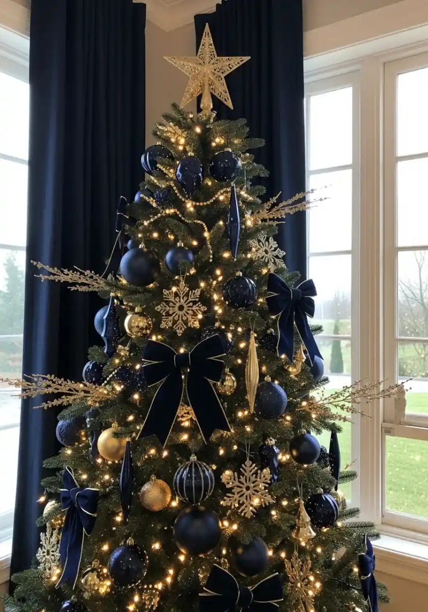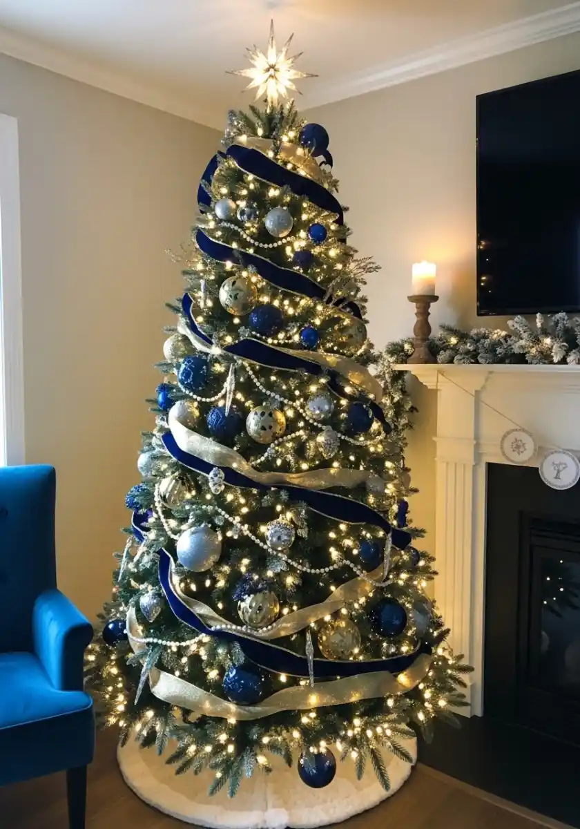 This tree is the one that convinced me the palette is magic. I used a navy velvet ribbon and a shimmery gold mesh ribbon, running them in relaxed spirals. The velvet gives depth, the gold catches every bit of light, and the combo pulls scattered ornaments into one story. I tucked in glass balls in cobalt, matte sky blue, and champagne gold. The topper is a star that throws warm light around the ceiling like soft fireworks.