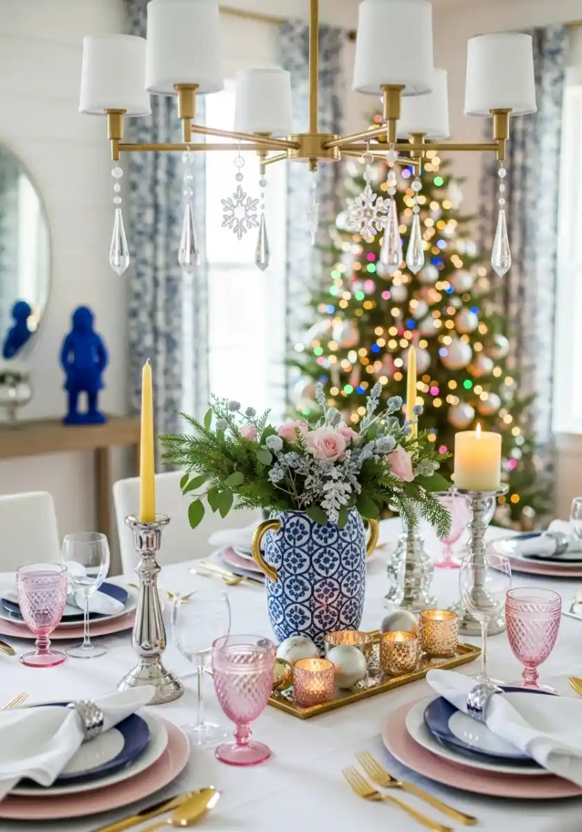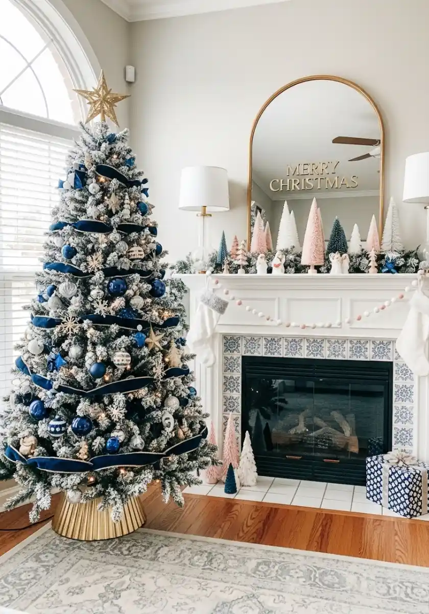 The last scene is soft and charming. A flocked tree with navy ribbon and blue ornaments stands near a white mantel dressed with a pastel bottle-brush forest and a simple banner. The mix of frosty branches and tiny trees gives a cozy storybook feel. Blue anchors the scene and gold arrives as little glimmers in the ornaments and in the mirror frame above the mantel.