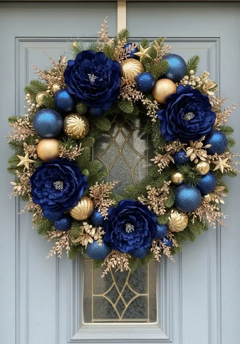 This front-door wreath is dramatic without being pushy. Three large royal-blue blooms nest among gold berries, glitter leaves, and mixed evergreens. I love how the round navy ornaments echo the door color and the gold pulls warmth from the porch light. It’s a warm welcome before guests even step inside.
