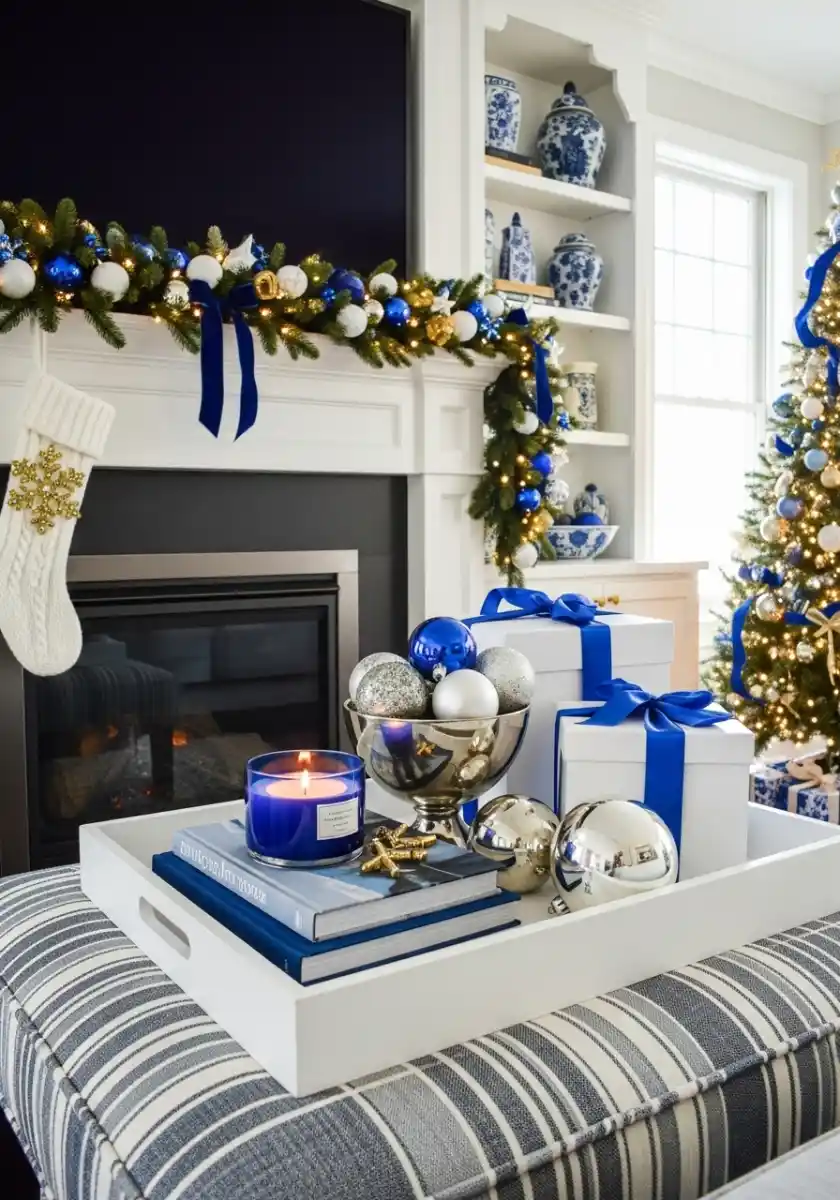 I used to ignore the coffee table, but pairing it with the mantel changed the whole room. On a white tray I stacked two blue books, a cobalt candle, a silver bowl of mixed ornaments, and a couple shiny spheres that catch firelight. Everything ties back to the garland above the fireplace, where navy ribbon tails hang between clusters of blue and gold balls. When the tree is lit, the trio talks to each other.
