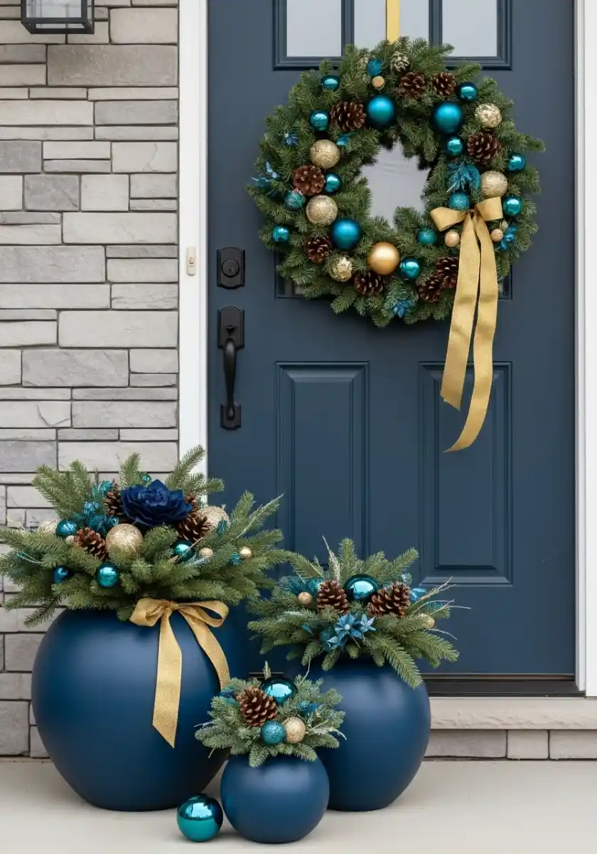 Absolutely. Try navy bows on wreaths with gold bells for blue and gold entryway decor. Use shatterproof ornaments for weather.