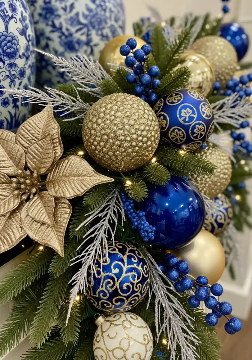 Build a green base, add blue ornaments in clusters, then tuck in gold sprays. That is classic blue and gold mantel decor.