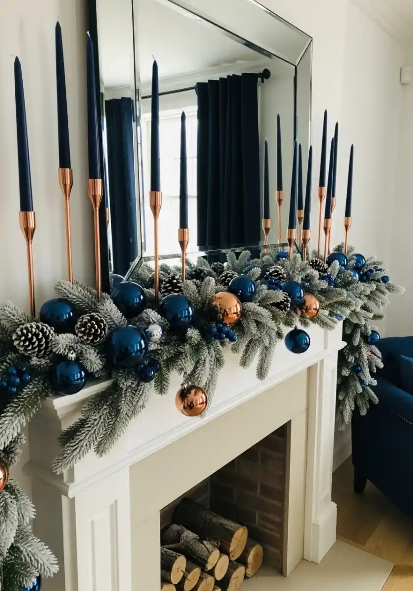 This mantel swag is a mood. Frosted branches spill over the edge while navy glass ornaments nest among flocked pine. Slim navy tapers stand in copper holders for a tiny hit of warmth. I didn’t expect copper to play nice, but it totally does. The metal bridges blue and gold like a translator, and the mirror above doubles the lights at night.