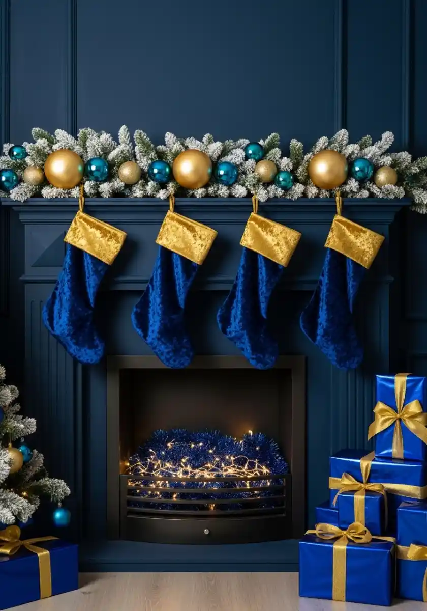 The hearth got playful. I hung four navy velvet stockings with gold cuffs under a snowy garland dotted with teal and gold ornaments. The contrast of dark paneling and bright baubles makes everything pop. I also wrapped gifts in glossy blue paper with gold ribbons and stacked them to one side like a tiny sculpture.