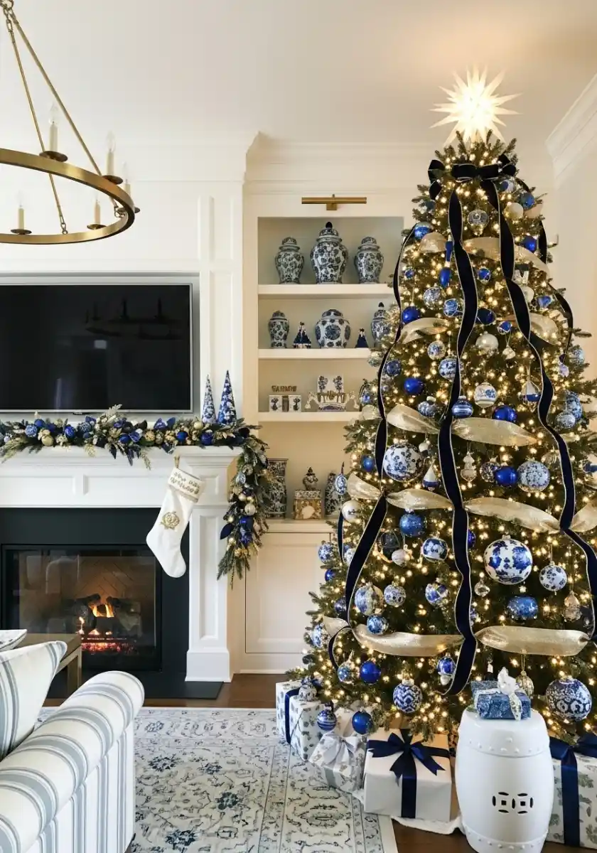 Design tip. Stick to two blues here, navy and cobalt, so the patterns don’t fight. Group porcelain pieces at different heights and keep golds near the lights. I set a couple cone trees on the mantel using the same colors, because repetition looks expensive. This is the refined side of gold and blue holiday decor, and even my minimalist friend admitted it was gorgeous, which says a lot.