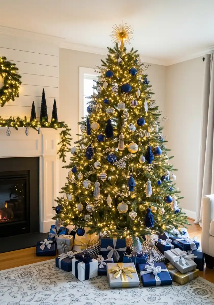 Why it works. Tassels bring movement and quiet luxury to blue and gold christmas decor without adding more shine. The coordinated wrapping extends the palette across the floor which makes the tree look bigger. If your budget is tight, buy two jumbo rolls and commit. Repeat, repeat, repeat. You’ll thank yourself every time you walk by and the stack looks store window ready.