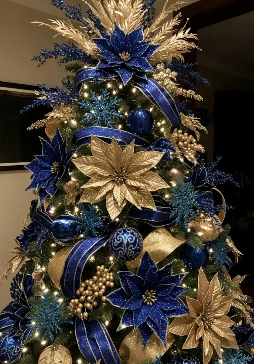 Up close, this tree wears giant glitter poinsettias in midnight blue and pale gold. I didn’t think I’d love big florals, but wow, they fill gaps fast and look like designer stuff. I angle each flower slightly outward so it faces the room. Between them runs a wide blue ribbon with narrow gold edges. The starburst floral sprays push out from the top like a crown. I felt a little extra and I don’t regret it.