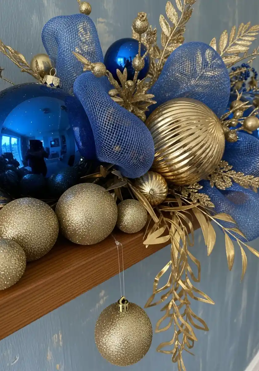 For a shelf vignette I played with volume. Big cobalt ornaments, ribbed gold spheres, and loops of wide blue mesh ribbon that puff out like little clouds. Gilded leaves frame the base and a single dangling gold ball adds a wink. It’s fun and fancy at the same time, which is basically my personality on December weekends.