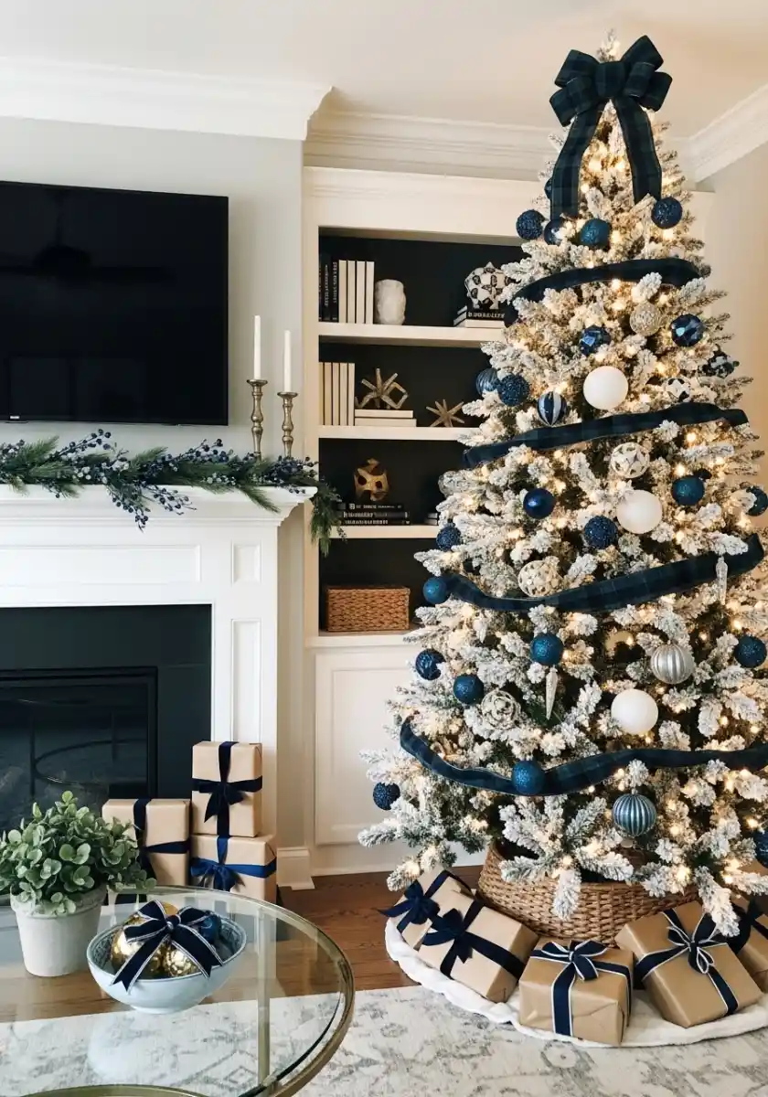 This flocked tree is like quiet snow with music on in the background. I ran a wide navy ribbon in relaxed spirals, then tucked in cobalt balls, matte sky-blue ornaments, and a few big white globes. The flocking already gives texture, so the blue does not need to shout. I tied the whole look to the mantel using a slim garland with blue berry picks and two brass candlesticks for height. Kraft paper gifts with navy ribbon carry the palette to the floor and make the base feel full even before real presents show up.