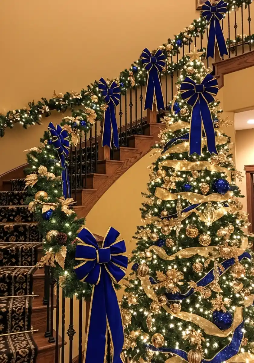 The staircase garland with royal blue bows was the boldest thing I tried, and it’s totally worth it. I anchored a lush green garland to the railing with zip ties every foot, then layered in gold poinsettias and clusters of ornaments. The big bows with gold edging sit above each post like little crowns. They’re dramatic but still neat, which I love. The tree near the stairs repeats the navy ribbon and gold mesh so the whole entry feels like one story.