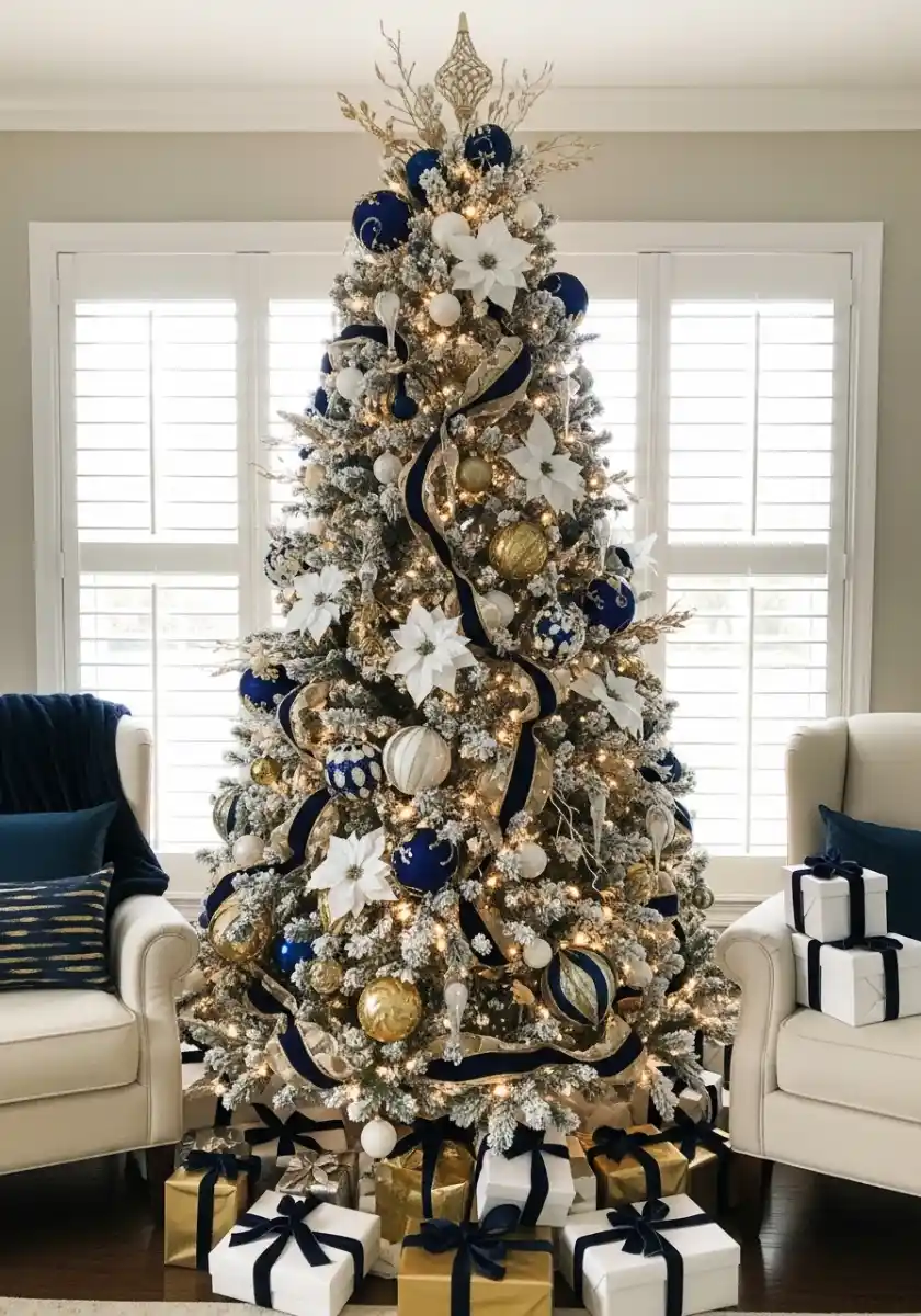 If you love calm, this tree is your friend. I used navy ribbon trimmed with gold, then layered white poinsettias and champagne glass finials. Large cobalt balls go deeper into the branches while smaller white and gold ones sit closer to the edge. The result is soft and elegant. Gifts under the tree wear white paper with navy ribbon, which looks clean and crisp.