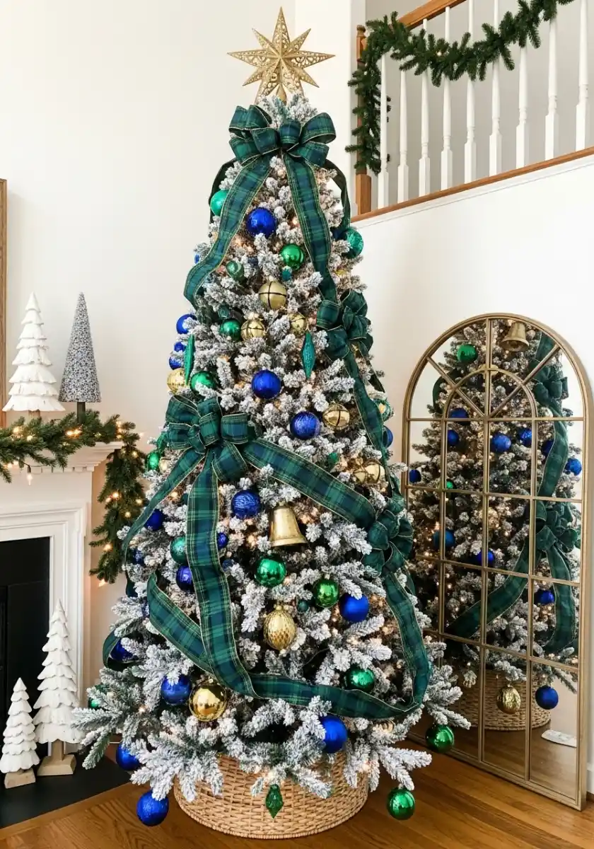 I wanted something playful for the family room, so I tried a green tartan ribbon with cobalt and emerald ornaments. I know, green isn’t gold, but listen. I sprinkled in shiny brass bells and a few gold pears, and the mix came alive. The plaid ribbon winds in big loops and ties into a fat bow at the top, which feels like a present you can’t wait to open. A wicker tree collar keeps it casual.
