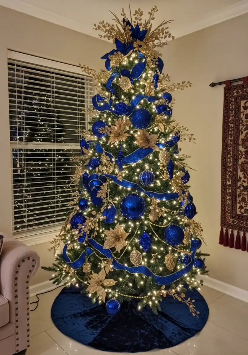 Yes. Use two or three shades, like navy, cobalt, and sky. This reads as layered gold and blue Christmas decor instead of matchy-matchy.
