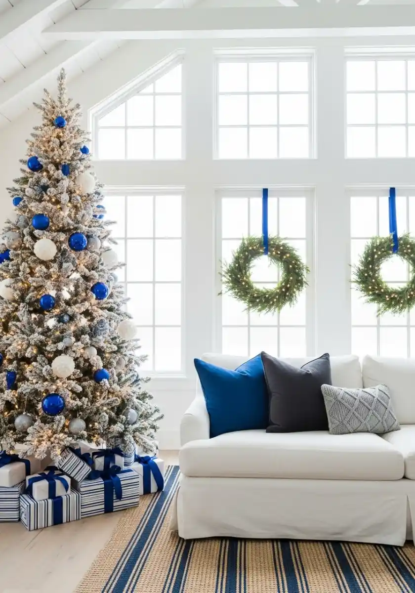 When a room has big windows and white walls, you can keep the palette clear and fresh. I hung three simple wreaths using bright blue ribbon loops, then set a flocked tree nearby with cobalt balls and soft gray ornaments. The sofa wears two blue pillows to echo the tree. Striped wrapping under the tree ties everything together without adding more glitter. This corner feels beachy and wintery at the same time.