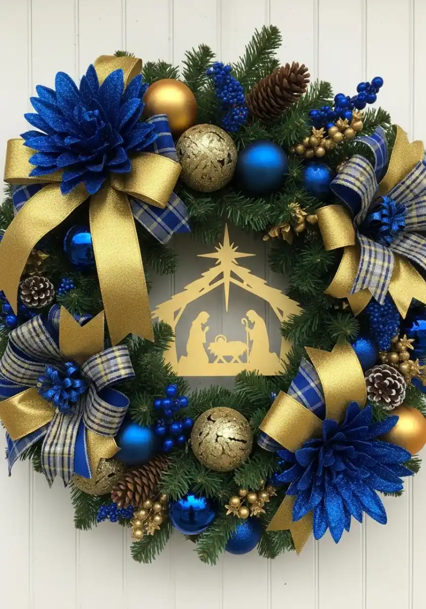 This wreath made me tear up a tiny bit because it mixes memory with style. Evergreen base, navy bows, golden bells, deep blue ornaments, and a simple nativity cutout at the center. The blue is peaceful, the gold is joyful. I used plaid ribbon with a slim gold stripe so it didn’t feel too formal. Pinecones add a little forest texture that balances all the shiny parts.