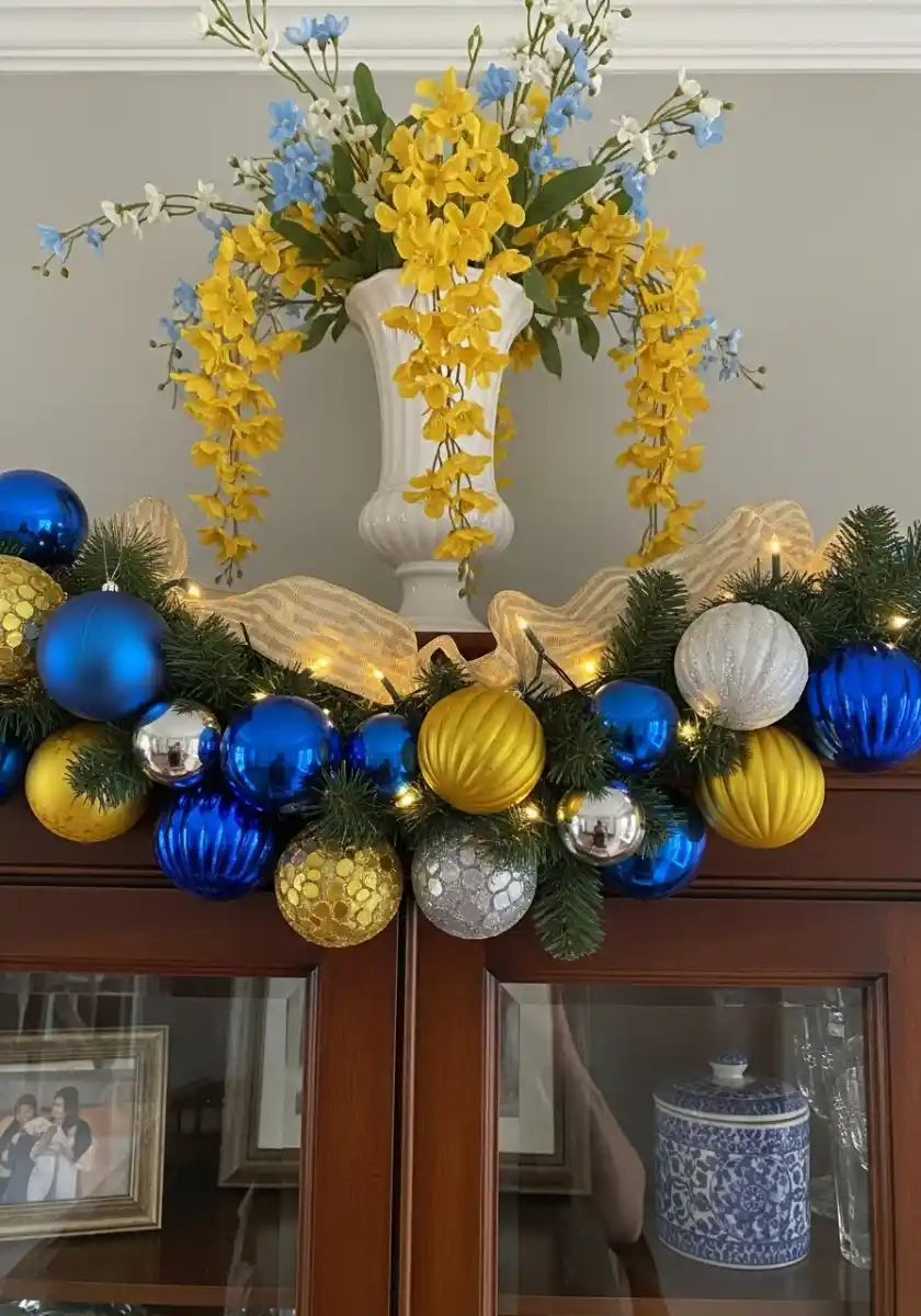 Here’s the secret. Use shatterproof balls for the top layer and real glass farther back where they’re safe. You can get the sparkle without the stress. If your space has yellow flowers or warm wood, the gold connects it all. This reads as blue and gold holiday decor from across the room and feels very grown up without feeling serious. When I dust the cabinet I just lift the whole garland off like a crown and set it back down later.