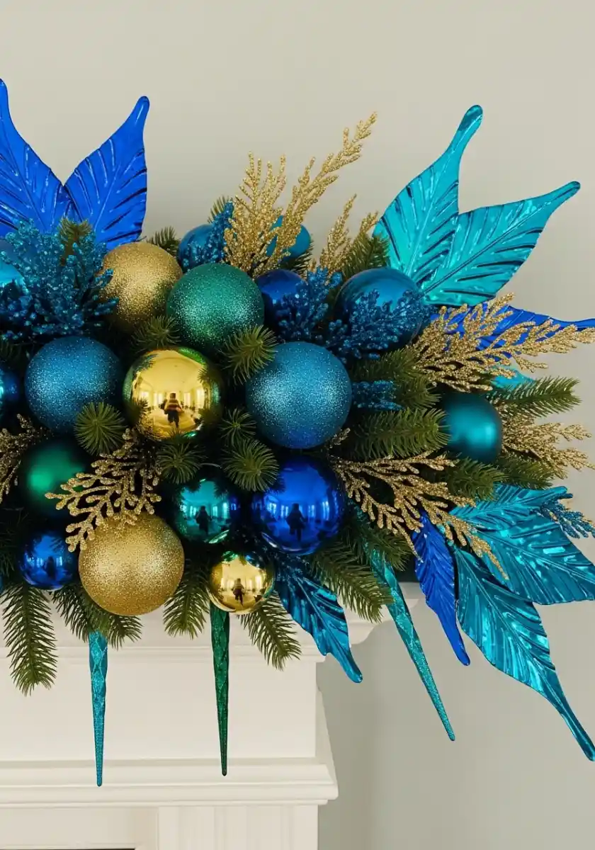I went bold on the mantel one year and now I can’t go back. A chunky swag of greens packed with teal, turquoise, and deep blue ornaments, plus gold leaves and glitter sprays. Then I tucked in long icicle picks so the edges point down like winter daggers. It’s a little fantasy, a little art project, and it makes the fireplace feel like a stage.