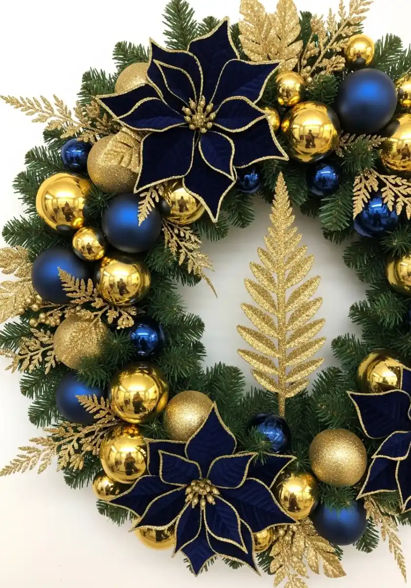 Another wreath, but this time the vibe is sleek. Midnight velvet poinsettias edged with gold sit on the greens like luxury stickers. I layered matte and gloss gold balls around them, plus a few navy spheres to tie in the rest of the house. In the center I placed a single glittery gold fern. It sounds odd, but it draws the eye to the middle and then back out again.