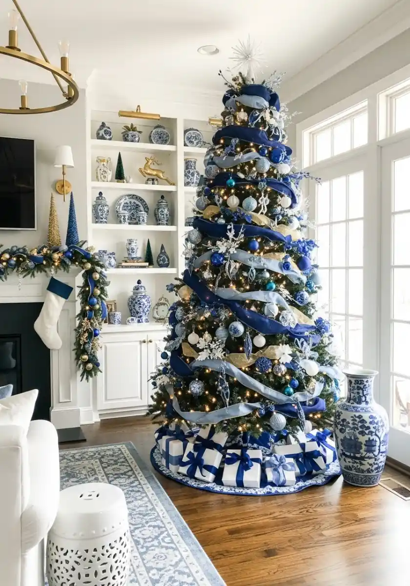 This tree is for pattern lovers. I wrapped three ribbons around it at once. Navy velvet, light blue satin, and a thin gold shimmer. The layers twist and overlap, creating movement even when the room is still. Ornaments range from glossy cobalt to hand painted blue and white spheres that look like china. Under the tree sits a skirt trimmed in navy and a ring of blue and white gift boxes with gold ties. It is a whole mood.