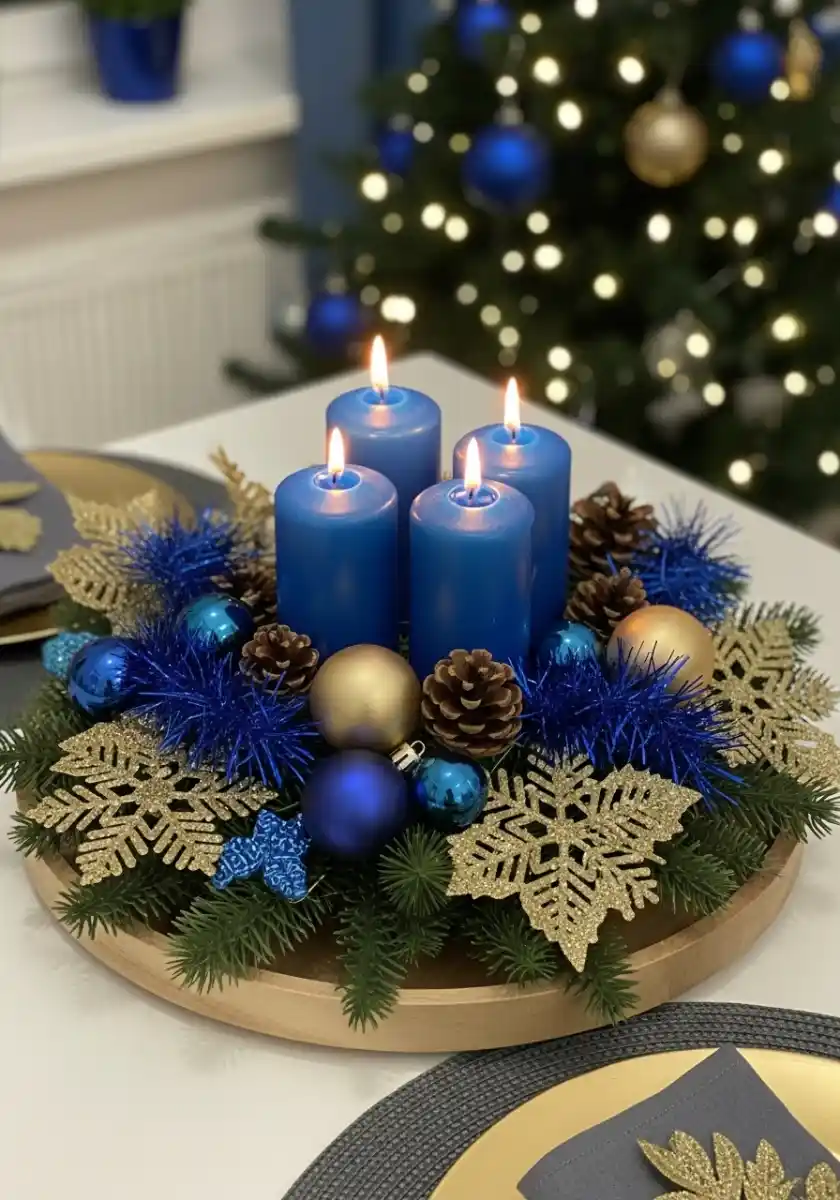 On the breakfast table I built a round centerpiece with four blue pillar candles sitting in a nest of greens. Around them I tucked pinecones, tiny matte blue ornaments, and glittery gold snowflakes. It’s simple, calm, and smells like fresh branches. We light one candle at a time in December, which makes the morning toast feel meaningful, even when I burn it a little.