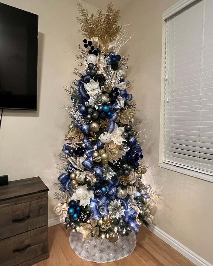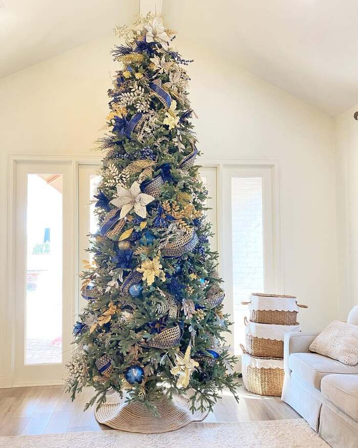 This super tall tree reaches into a bright, vaulted room and wears navy like a tux. The look mixes deep blue ribbon, gold leaf sprays, and oversized glitter poinsettias. It’s the anchor of my 8+ blue and gold christmas tree list because it proves drama can still feel calm. The trick I stole is ribbon layering. Use one navy satin, one patterned mesh with gold, and one narrow metallic accent. Start at the top and feed them in soft S curves instead of wrapping straight lines. That shape reads expensive even if your ribbons aren’t.