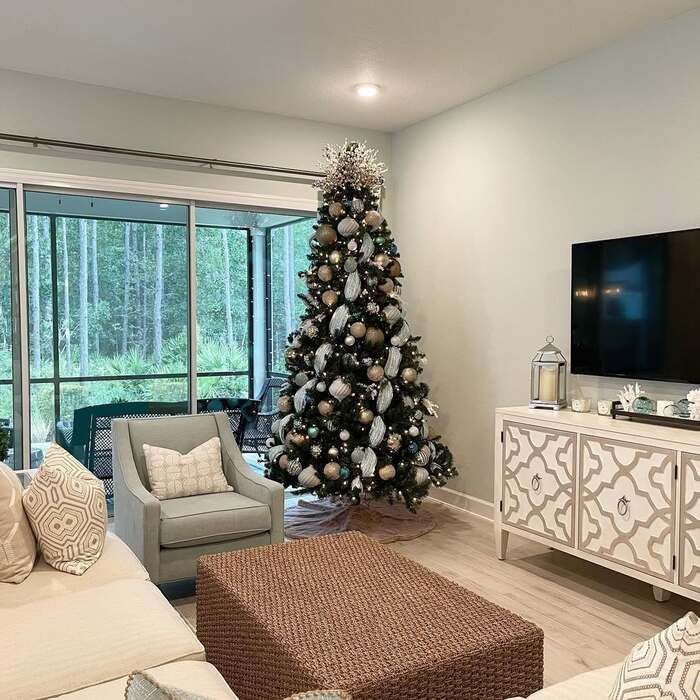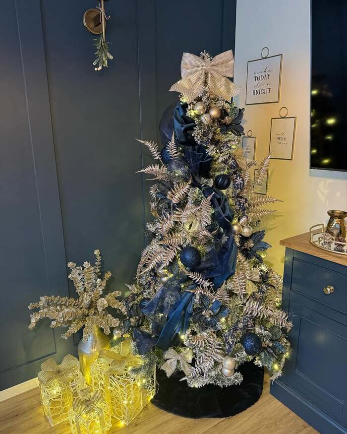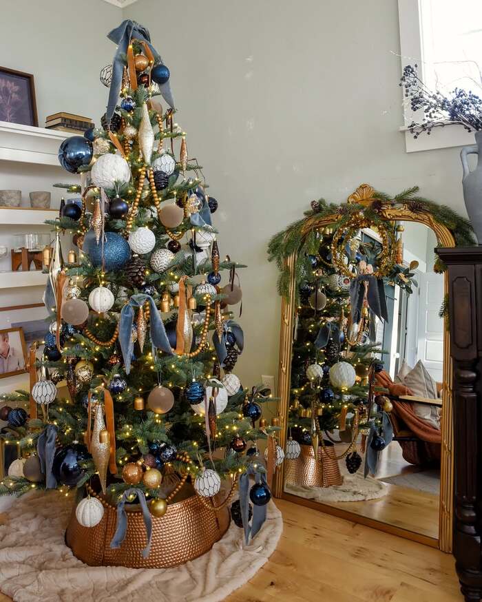 This slim corner tree feels relaxed and airy. The woven basket collar makes the tree read “designer” right away, and the soft pampas grass picks at the top are quietly glam. Start with champagne lights. Layer in small blue balls first, then larger cream or pearl balls. Add pale gold leaves and a few navy flowers. It’s a gold and blue Christmas tree that plays nice with Scandinavian or modern rooms.