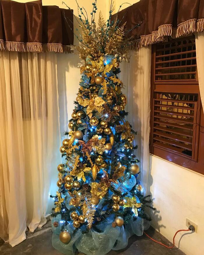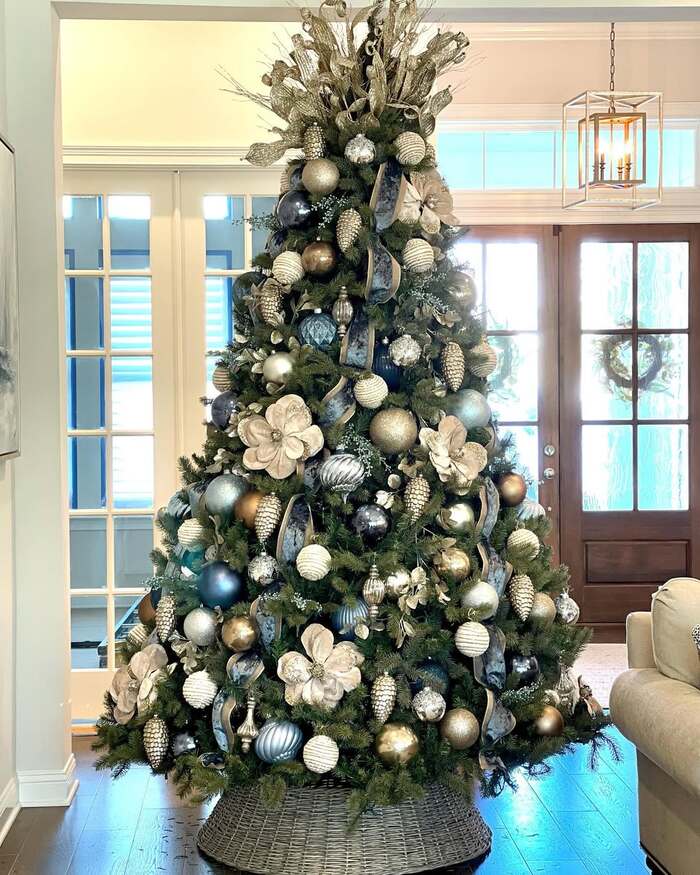 This design leans warm with amber lights and heavy gold florals, plus pops of blue shining through. At the base, a soft aqua mesh skirt or pouf hides the stand and bounces light upward. It’s a gold and blue Christmas tree with a touch of tropical glow. I didn’t think aqua would work with navy, but it actually helps the gold look richer.