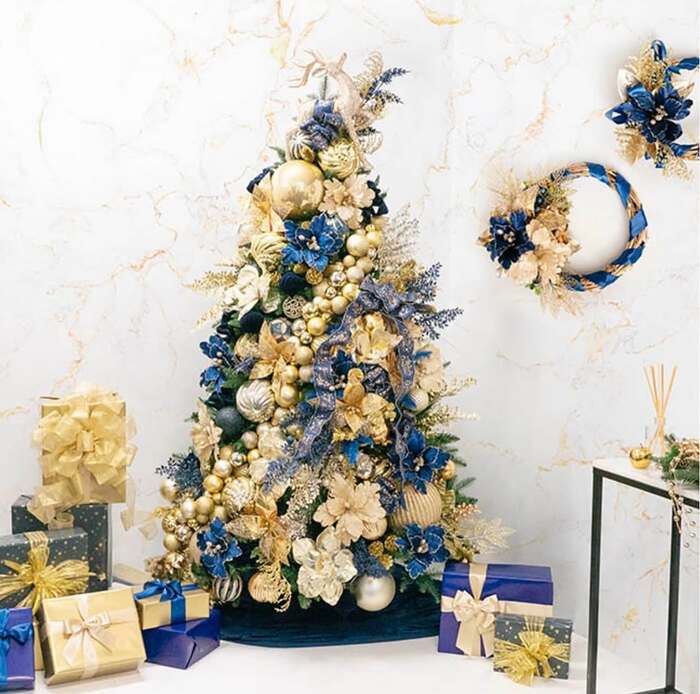 This design is bright and cheerful, perfect for public spaces where you need a read from across the room. Royal blue balls sit next to vivid gold stars and butterfly picks. The star topper goes classic but shiny. If you’re decorating a studio, salon or lobby, copy the gift wrap trick at the base so the color lands at eye level for kids too. Use sturdy wired ribbon and large shatterproof ornaments for safety. Your blue and gold themed tree will survive December and still smile in January.