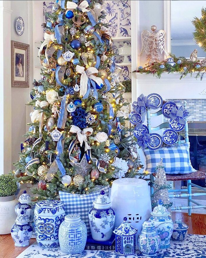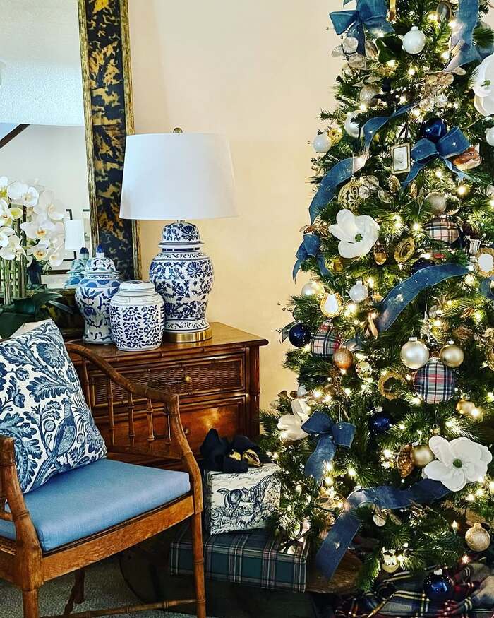 Okay, I squealed a little when I saw the ginger jars next to the tree. The room already had blue-and-white pottery, so the tree brings that heritage vibe into the holidays. The ribbon uses navy velvet and a subtle plaid. Sprinkle white magnolia blooms and add a few tartan ornaments to nod at the chair cushion. I love a blue with gold Christmas tree that listens to the room instead of bossing it around.