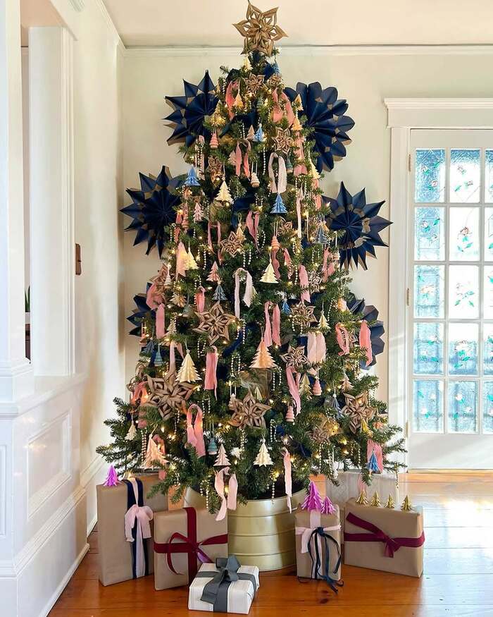 To copy it, limit blush to about twenty percent of the surface. Too much and it turns into a different theme. Use kraft paper gift wrap with navy or blush ties to ground it. Those 3D paper stars are a secret weapon. They fill wall space and make your tree look styled by a pro. I’m calling this the modern cousin in the 8+ blue and gold christmas tree crew, and it convinced me to stop hoarding ribbon scraps and actually use them.