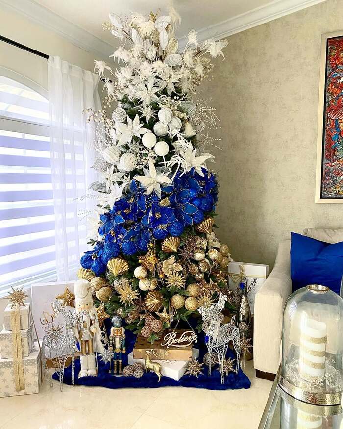 Under the tree, ground the look with a rich blue tree skirt or velvet throw. Bring in nutcrackers, deer, or metallic gift boxes to echo the gold. It creates a story without being cheesy. If your room is neutral, this royal blue and gold Christmas tree becomes the hero. If your walls are colorful, lighten the top even more so it doesn’t feel heavy.