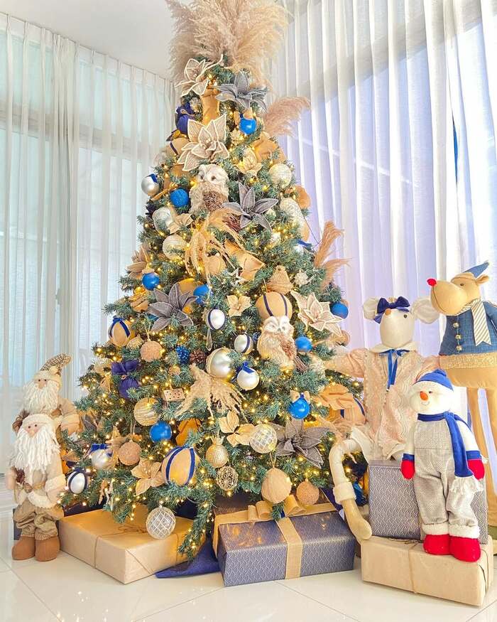 This cheerful take uses pampas plumes as a topper and mixes in plush toys around the base. Don’t roll your eyes. It’s cute, I swear. The blue ornaments are bright and round, and the gold is warm, almost caramel. I hung a few owl and star ornaments to keep the vibe fun. If you’re after a family friendly blue-and-gold Christmas tree, this checks the box.