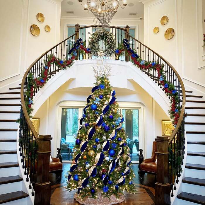 Blue and gold christmas tree inspiration: the airy foyer showstopper