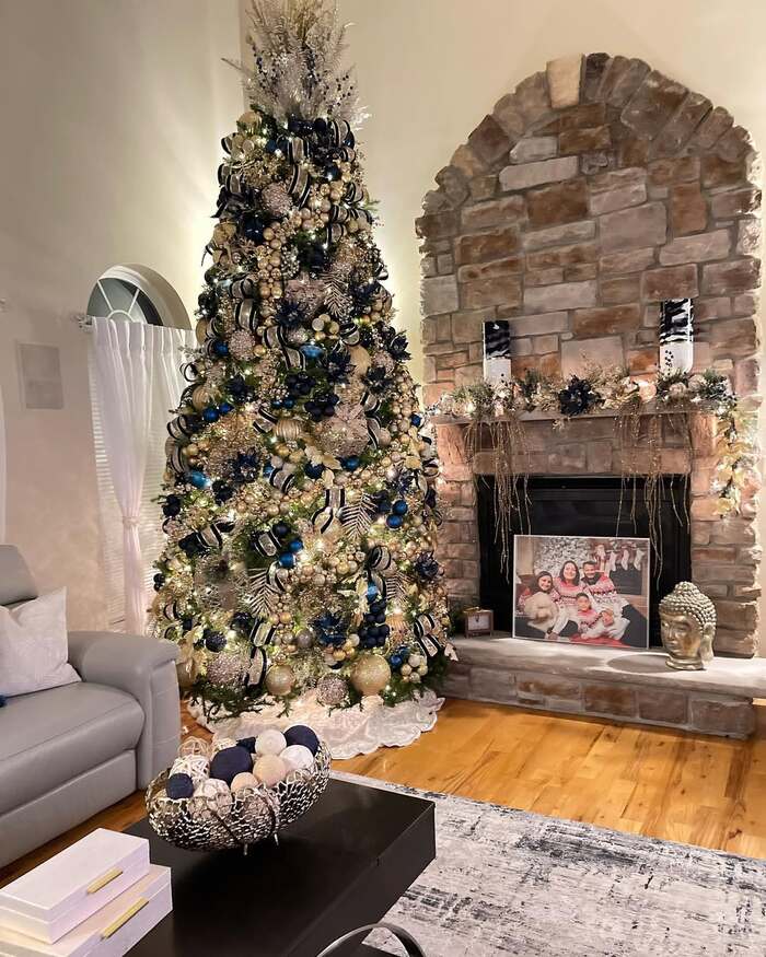 This one sits by a big wall of windows with a cool-gray chair and a woven ottoman. It leans coastal without seashells, which I weirdly appreciate. Start with warm white lights and let the greenery breathe a bit. Add matte taupe ornaments to bridge the navy and the gold so the palette feels friendly not shouty. I tried copying this balance at home and noticed I needed fewer ornaments than I thought. Empty branches create depth, and that’s what makes a blue and gold Christmas tree look grown-up.