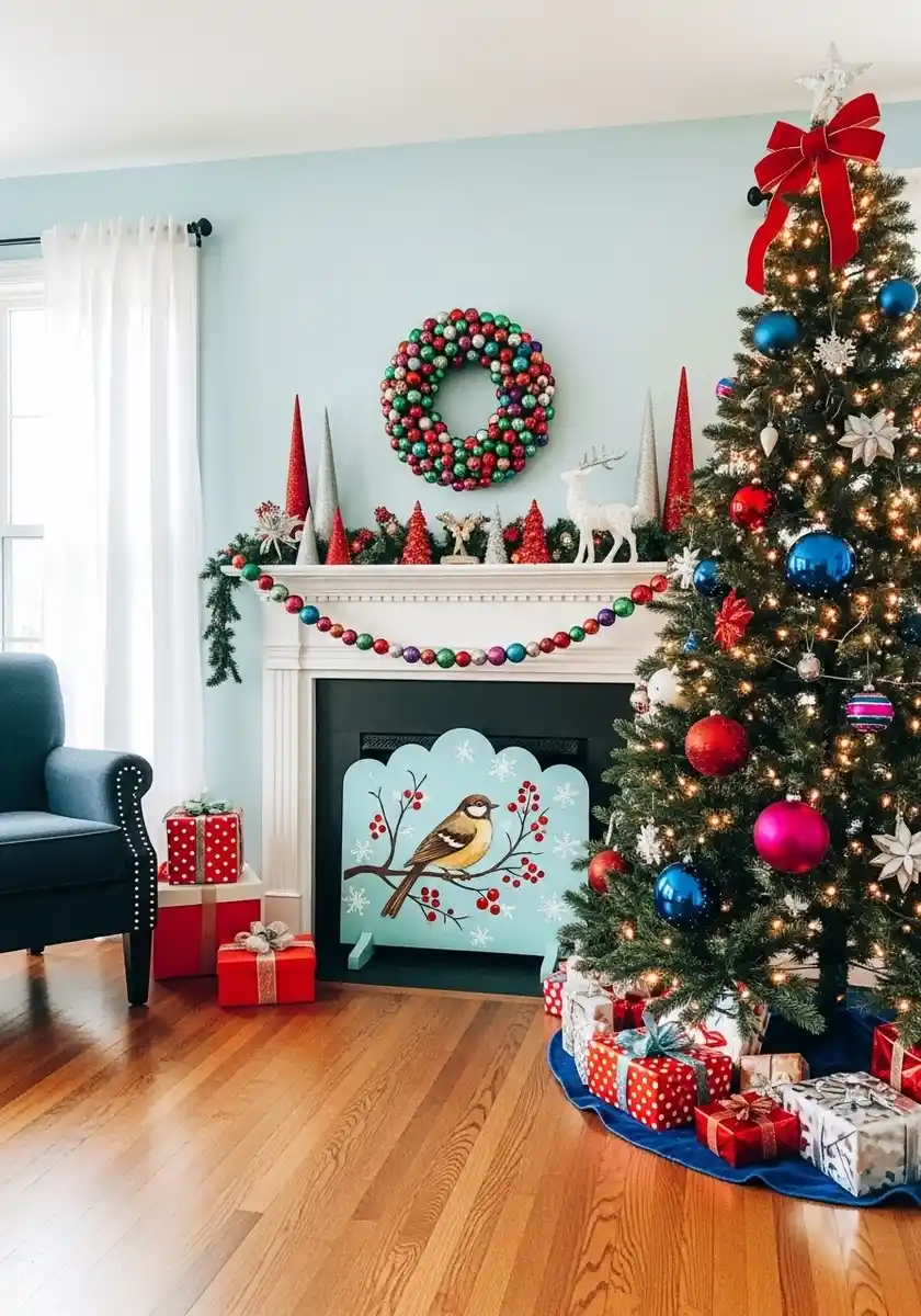 In a sky-blue room, a ball-ornament wreath hangs above cone trees in red and silver. A garland of multicolor balls leans heavily on blue and red, which ties to the Christmas tree across the room. That tree repeats the palette with cobalt and cherry ornaments plus a big velvet red bow topper. I love the painted bird fire screen. It gives folk charm without breaking the blue and red christmas decor story. Keep gifts wrapped in a mix of polka dots and stripes so the whole thing feels happy.