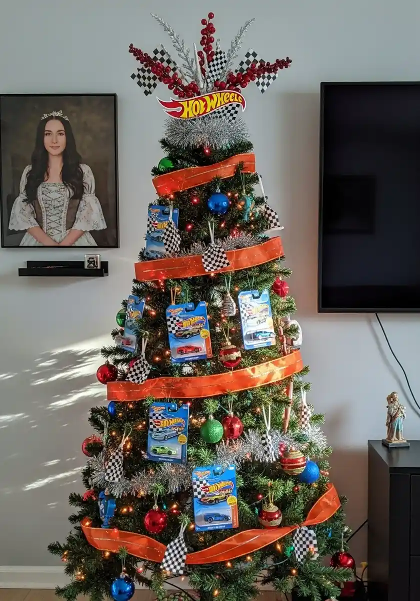 For kids who love speed, wind bright orange “track” ribbon around the tree. Clip in checkered flags and hang packaged Hot Wheels cars as ornaments. Mix in classic red and blue balls, silver tinsel, and berry picks so it still reads Christmas. This red-blue holiday scheme makes present opening even more exciting. If you want a calmer look, keep the track ribbon just near the top third and use smaller loops. Either way, it’s a crowd pleaser.